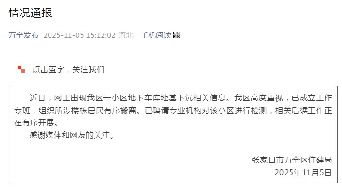 近日,网上出现该区一小区地下车库地基下沉相关信息。该区高度重视,已成立工作专班,组织所涉楼栋居民有序搬离。已聘请专业机构对该小区进行检测,相关后续工作正在有序开展。